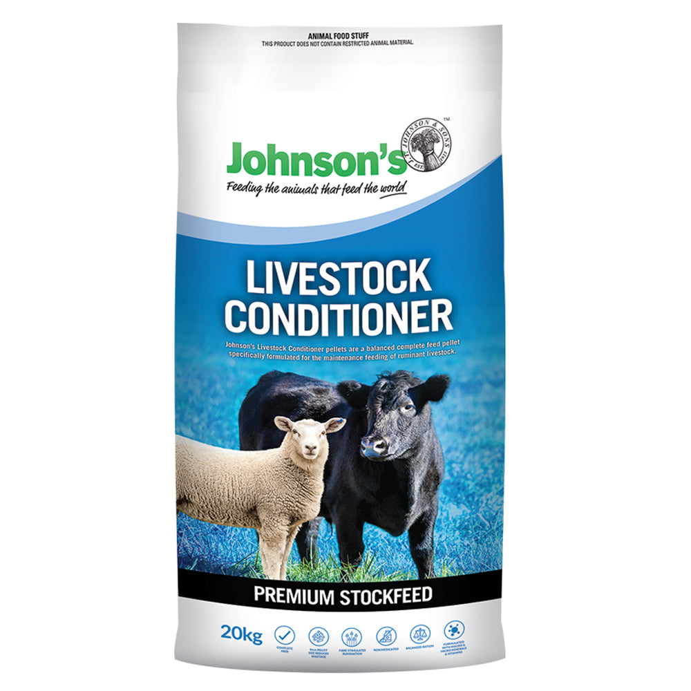 Johnson's Livestock Conditioner 20kg is a carefully formulated pelleted feed designed to support cattle, sheep, and goats during periods of pasture scarcity. Its balanced blend of grains, hay, straw, soybean meal, and essential minerals and vitamins promotes consistent nutrition and helps maintain optimal body condition. This conditioner encourages rumination and ensures a smooth, safe transition to other feeding programs, making it an essential component in effective livestock management.